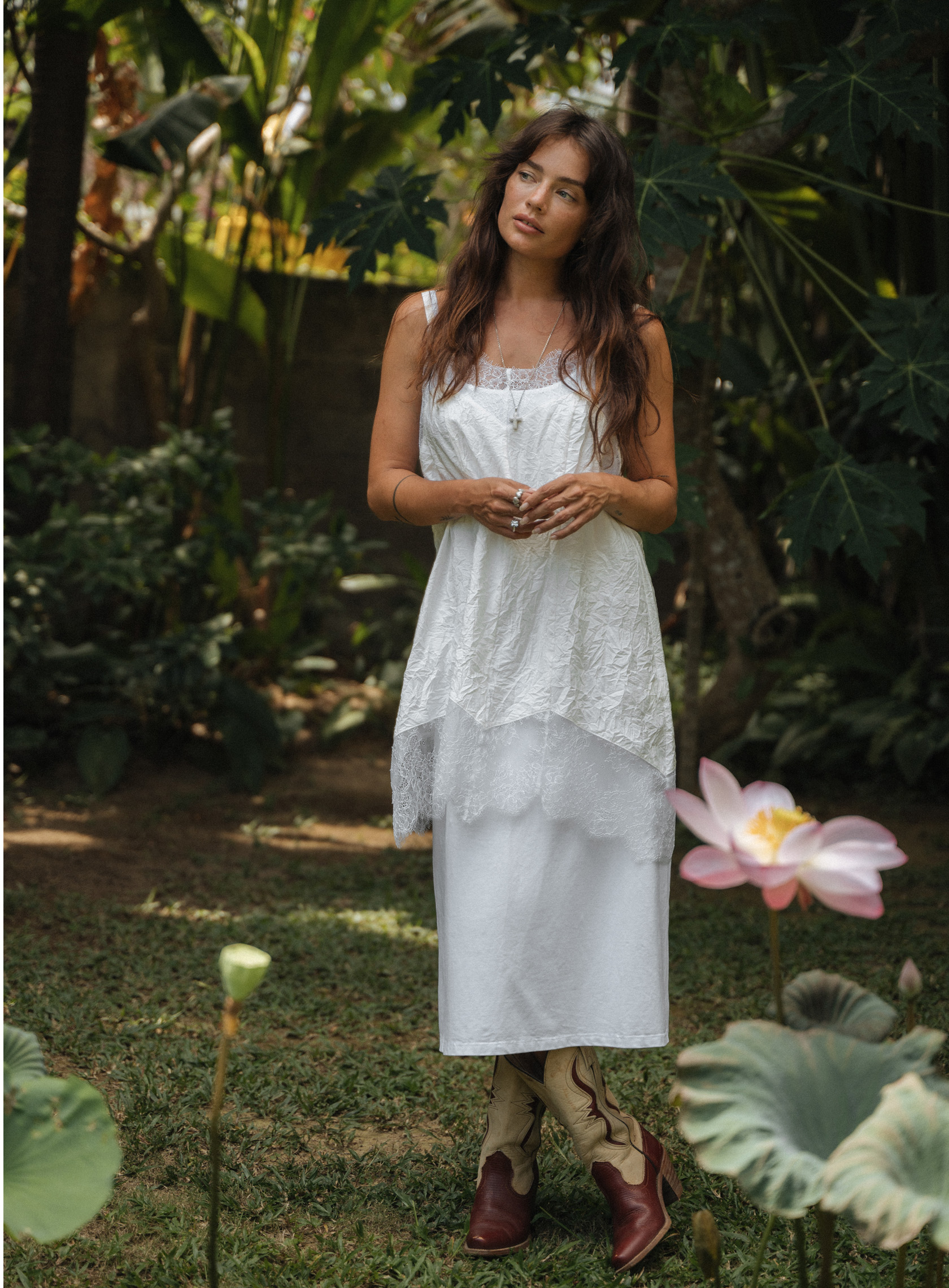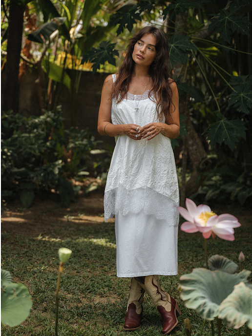 Нежное платье-сорочка на тонких бретелях из мягкой вискозы с эффектом "крэш". Ассиметричный низ и французское кружево. Свободный крой в бельевом стиле позволит чувствовать себя комфортно и легко. Регулируйте посадку за счет регулируемых бретелей.